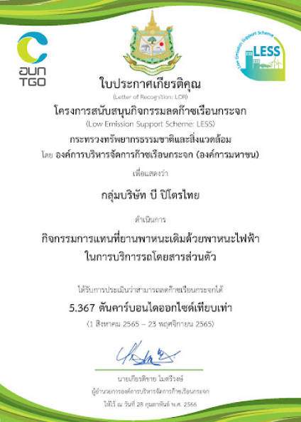 On August 28, 2023, BE Petrothai Group received a certificate of recognition from the Low Emission Support Scheme (LESS), a project supporting activities to reduce greenhouse gas emissions, by the Ministry of Natural Resources and Environment and Thailand Greenhouse Gas Management Organization (TGO). Since BE Petrothai Group replacing fuel vehicles with EV cars started on August 1, 2022.